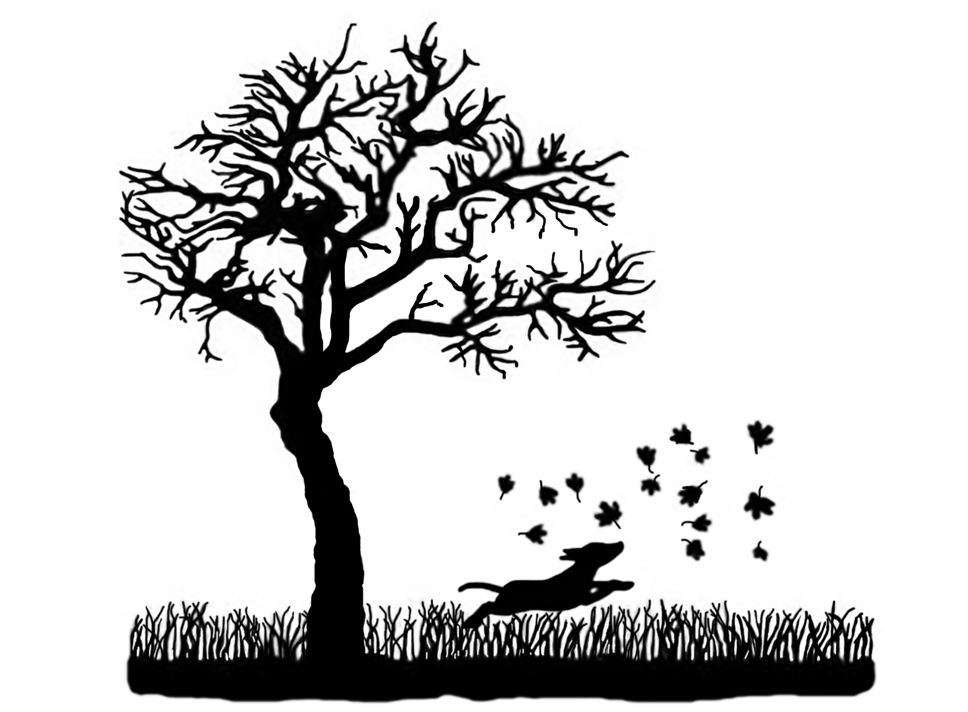 Large Tree with dog chasing falling leaves scene in black silk screen enamel decals.